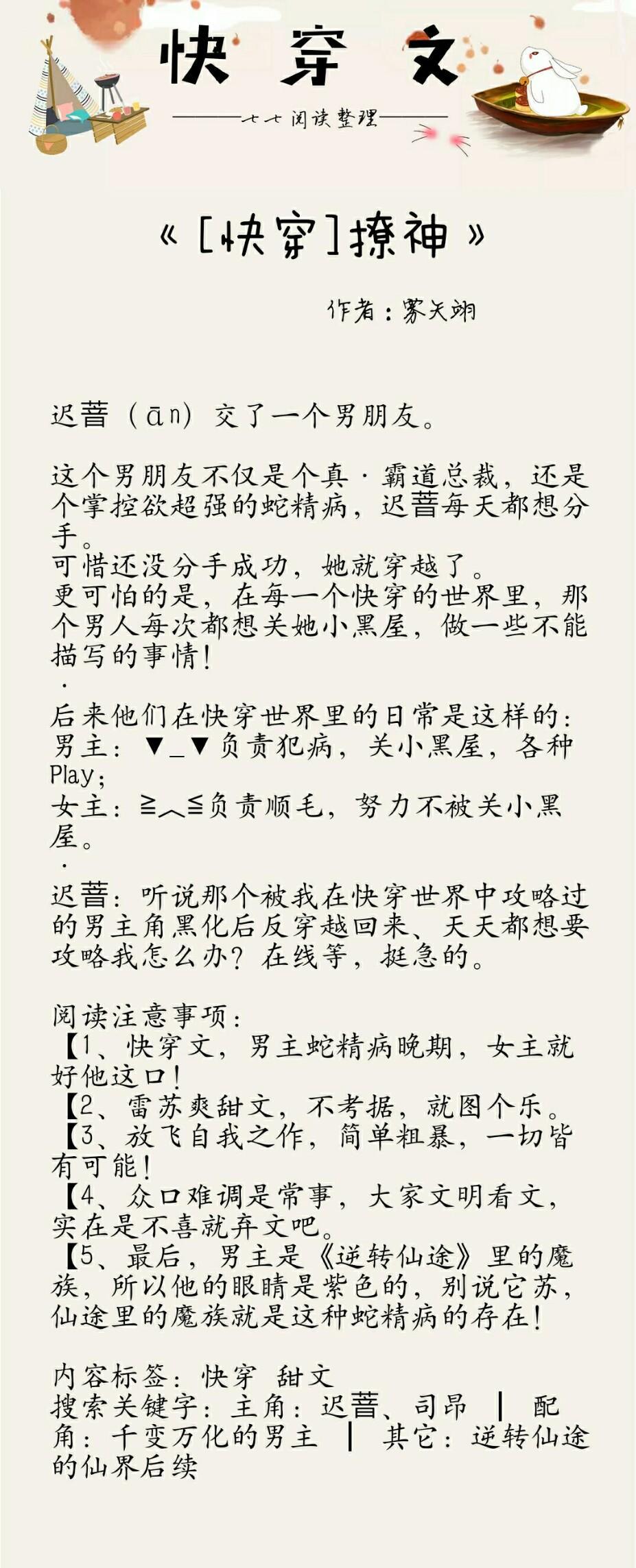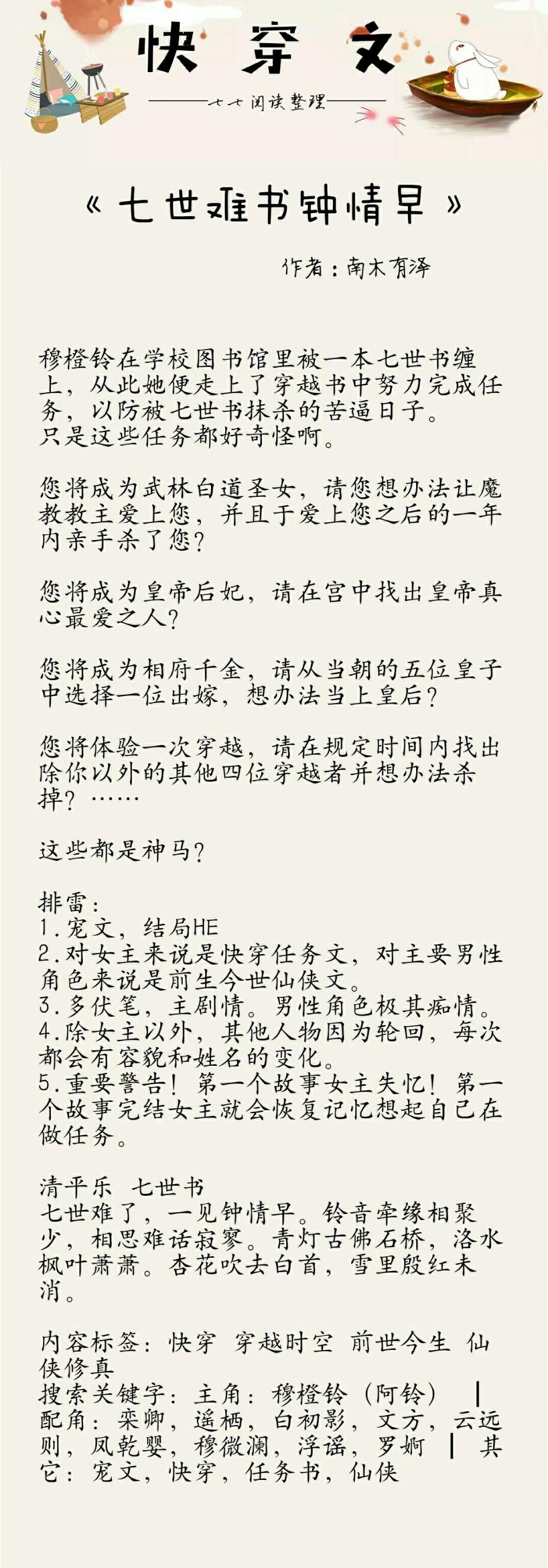 Ps:女主一开始因为一本书走上完成任务的快穿之路,但其实都是因为她与男主的七世情劫。七世情缘七个故事,宫斗、灵异、民国、仙侠...等等,伏笔多多,每个故事都特别感人。男主超级深情,女主性格也很好,有柔有刚,作者这本书从动笔到完结大概花了她一年的时间,真的挺不错的文