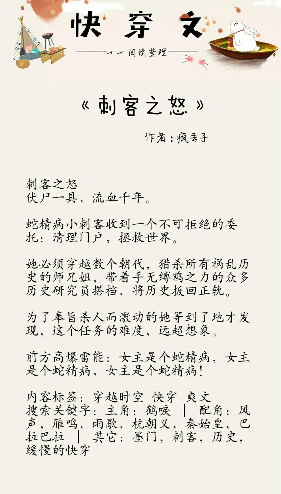 Ps:疯丢子大大的书,女主蛇精病刺客,收到任务需要回到过去杀掉想改变历史的师兄师姐们,第一次穿就遇到了男主,但两人交集不多。男主是战国时期吕不韦很信任的刺客,在认识了女主之后,自己在战国过了几年,后来意外去到现代,就开始陪女主完成一次又一次的快穿的任务。女主反派,男主忠犬而且武力值很高,有脑洞有剧情的文,大大在尊重历史,故事发展跟人物塑造都挺有逻辑性的