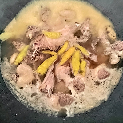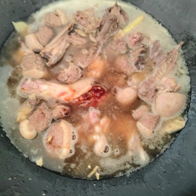 3、起锅,锅中放水煮开把鸭肉,姜片,料酒氽一下,捞出来洗干净,沥干水份