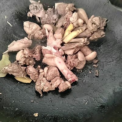 5、起锅锅里不要放油直接放入鸭肉和姜片,翻炒至水干,再放入茶油。
