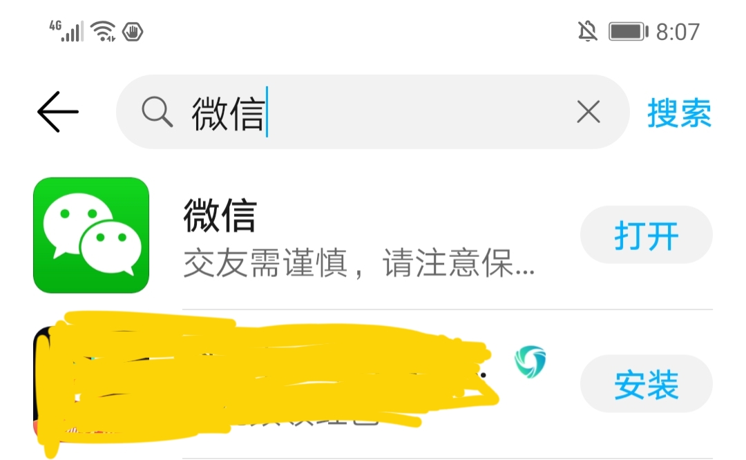 然后在主页的的搜索栏中输入“微信”进行搜索,在搜索的结果中,如果微信后面的按钮是“