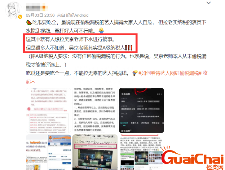 吴京粉丝表示应该是有人想拉吴京下水进行搞事,也可能是有人想转移目标,将矛头对准吴京减少对真正偷漏税艺人的舆论,粉丝曝光了吴京是A级纳税人的证据来澄清谣言。