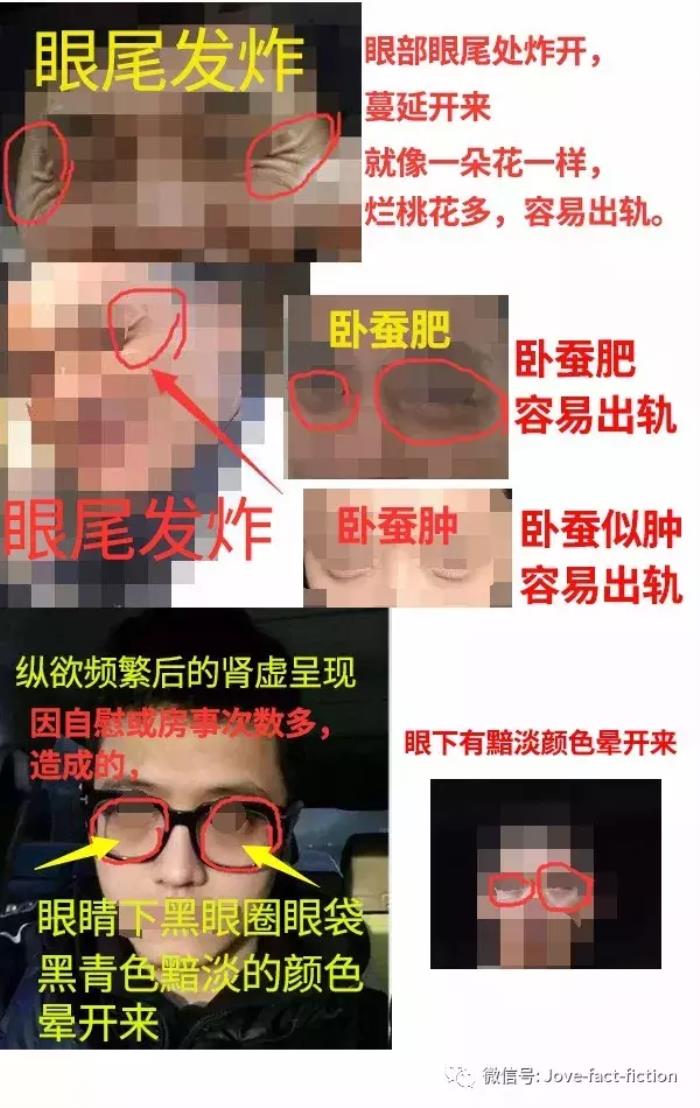 1,眼尾发炸。笑或不笑的时候,眼尾位置开出花来,且向上翘(上扬)。容易出轨。若一个男人年纪轻轻,不笑的时候,眼尾纹炸开来,烂桃花多,若把持不住,出轨的可能性很大。