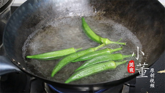 1、锅中放入一点油,少放一点盐,放入秋葵焯水三十秒钟,等秋葵颜色变深然后捞出来