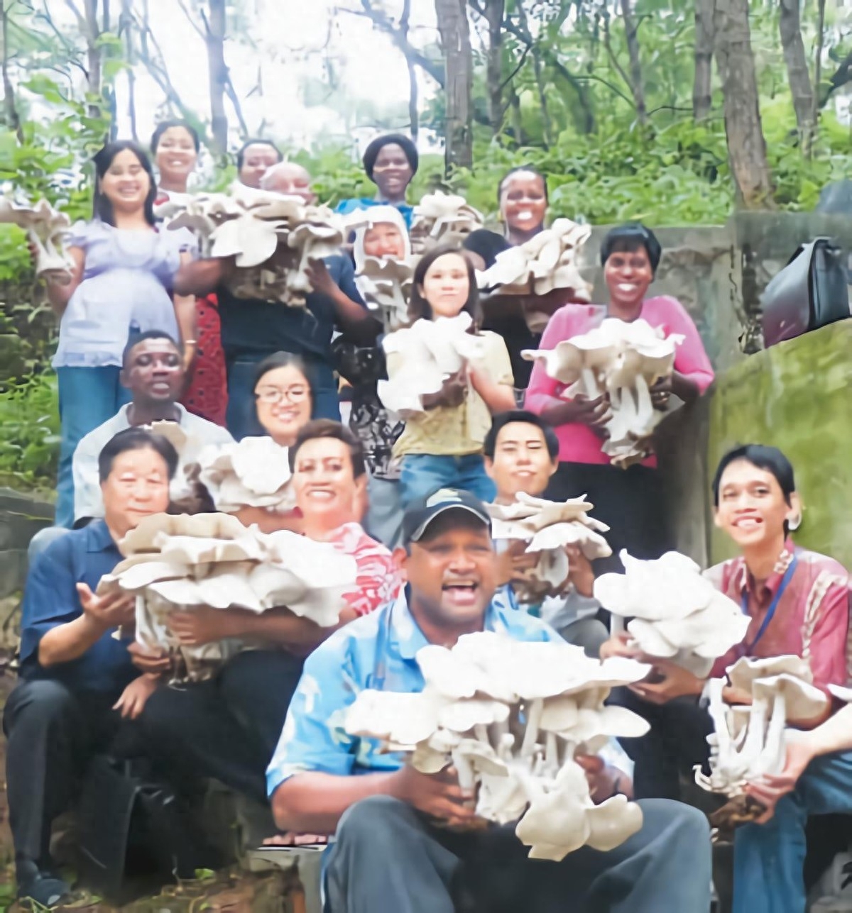 林占熺在福建农林大学指导“发展中国家菌草技术培训班”学员采收自己栽种的菌草菇