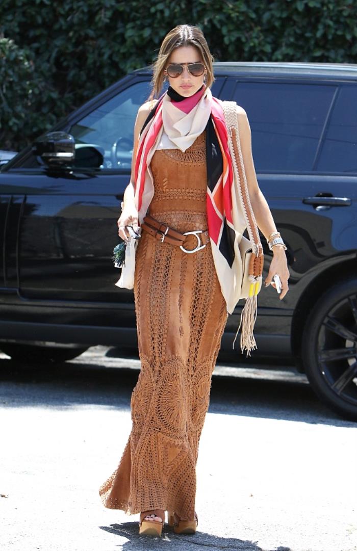 或者象上图这样,把丝巾展开,固定在腰间,当成裙摆的一部分。浪漫又时髦。上图这件白色的连衣裙和蓝色的印花丝巾搭配得和谐又特别,非常好看的丝巾搭配。