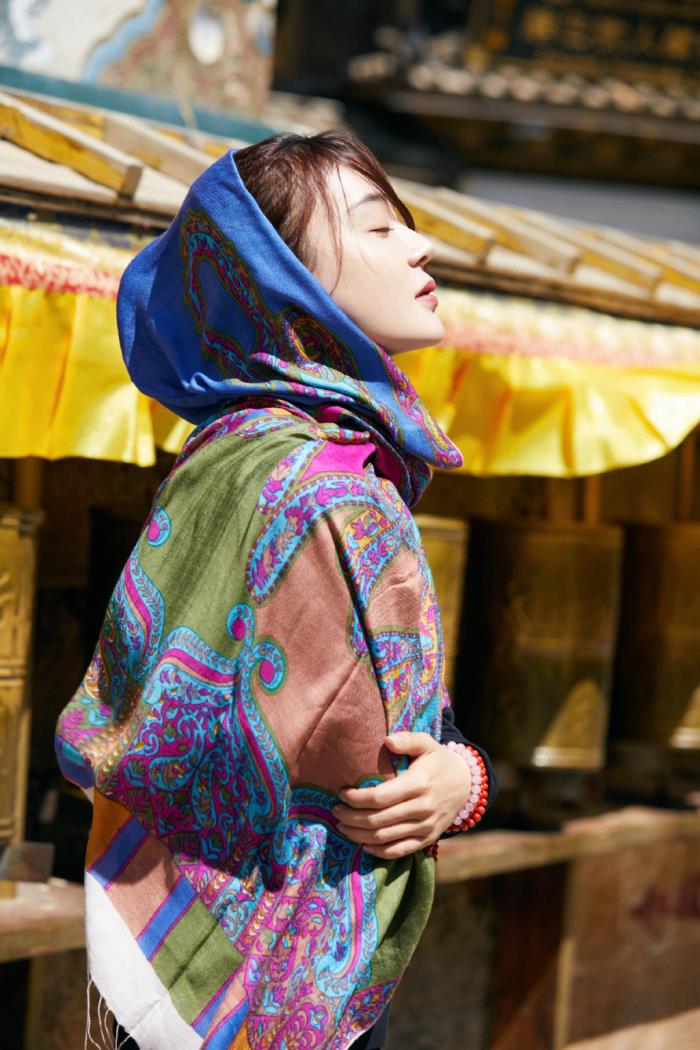 如果你的方形丝巾比较大,那可以用来包头,在脖子处打个结,余下的部分当成小披肩,浪漫又复古。这戴法很适合在度假时有风的日子里用,保暖防风又浪漫。