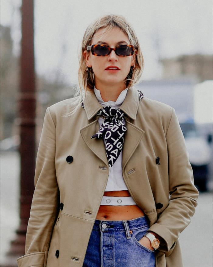 丝巾折后的三角形在胸前,面积可以大一些,把内搭的衣服盖住,然后再穿外套,这样从外面看到的就只是丝巾,看不到内搭。就算是里面的内搭和外套不太配,或露出来不好看时,从外面看也会很得体的。