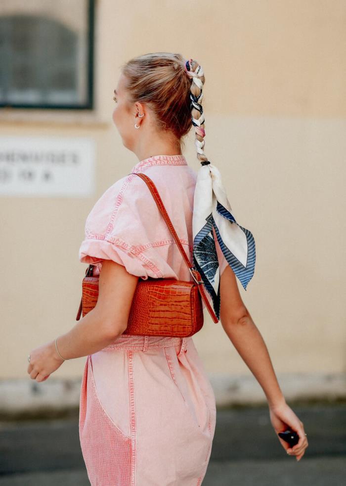 丝巾当头花用也是很好看的。比如把一个方形小丝巾折成长条状,绑在半马尾的辫子上,浪漫又甜美。就像上图这么操作就行了。