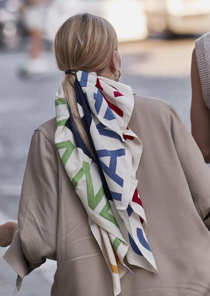 方形丝巾折成长条绑在头发上,浪漫又时尚