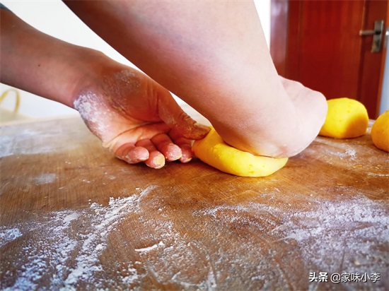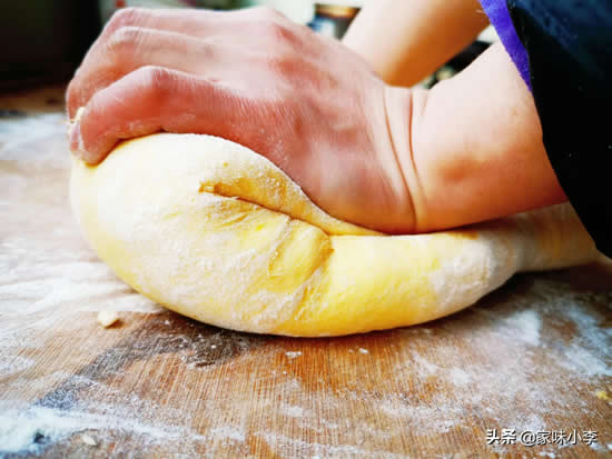 开始揉馒头,左手按着有手揉,多揉几个来回后收口团成馒头状,一个馒头就这样搓好了。