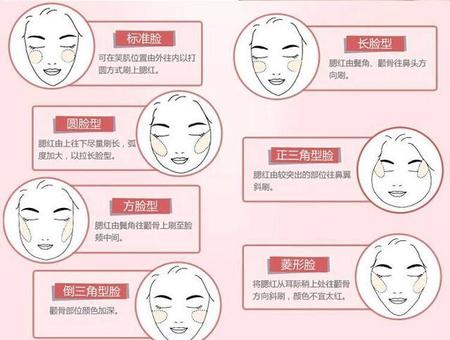 第四个就是腮红啦,小伊平时画腮红都是画太阳穴到颧骨到眼下,既可以修饰脸型,也会显得很可爱,下面附一张不同脸型腮红画法图,各位小仙女们可以参考一下哦