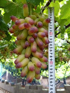 - 金手指葡萄苗结果什么样?蓝宝石葡萄苗优缺点介绍 金手指葡萄:果穗巨大,长圆锥形,松紧适度,平均穗重750克,最大穗重1500克。果粒形状奇特美观,长椭圆形,略弯曲,呈弓状,黄...