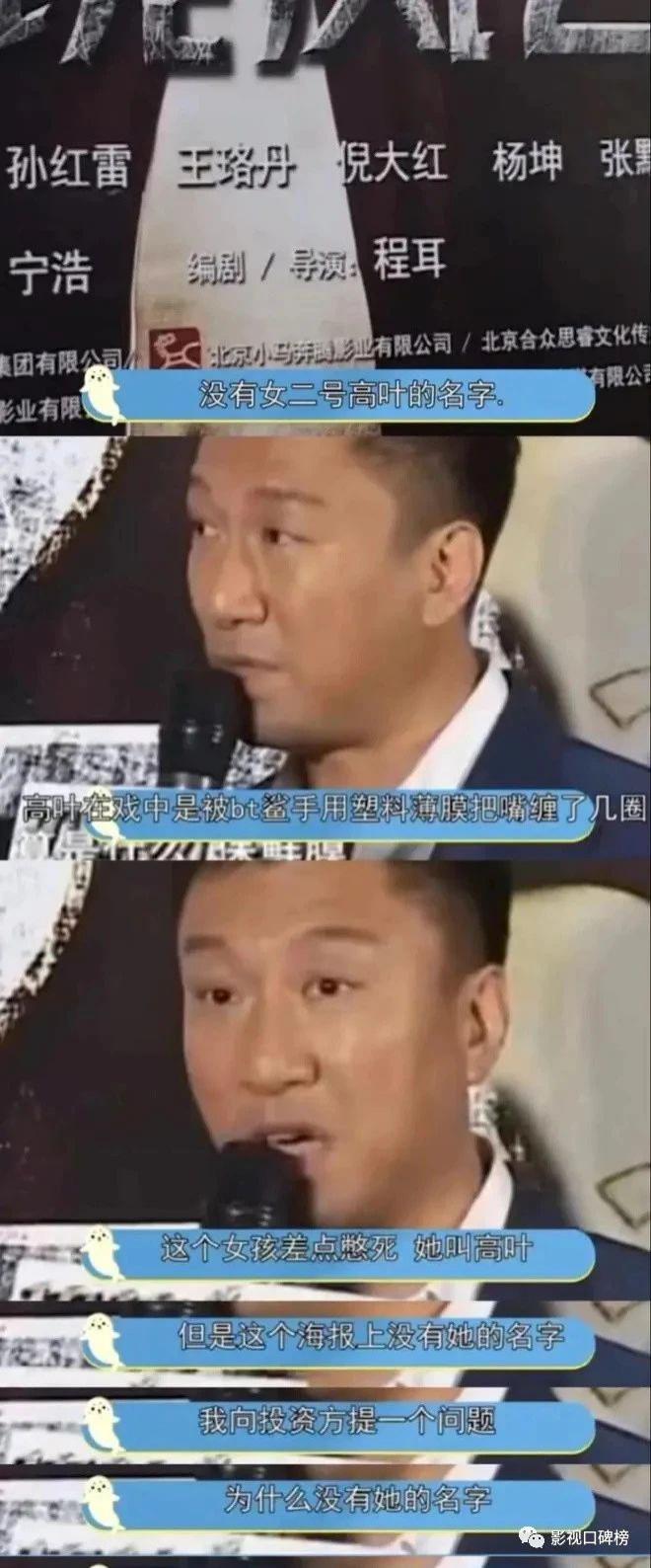 高叶的敬业却没有换来投资方的重视,反而被忽略。在宣传海报上居然没有她的名字,孙红雷为她感到不值,在公开场合为她声讨。