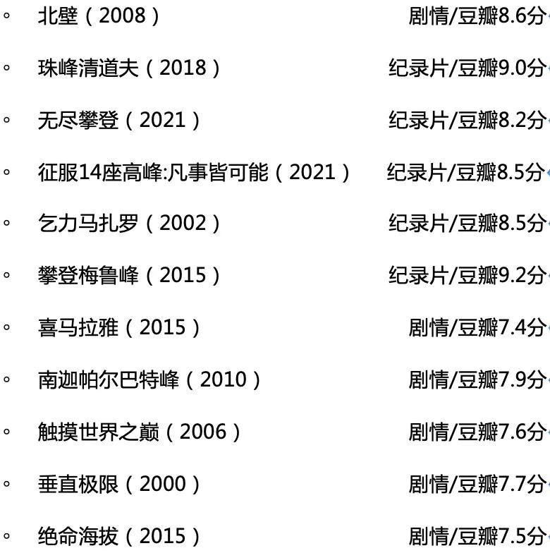 发现专门讲户外的电影片单比较少,细分到登山的就更少,且以八九十年代的老片和纪录片居多,纪录片看多了有些千篇一律,老片的视觉语言有些看不进去,所以选取2000年后、豆瓣评分7.0+、叙事主线清晰的纪录片+故事性强的剧情片组成了这个片单~