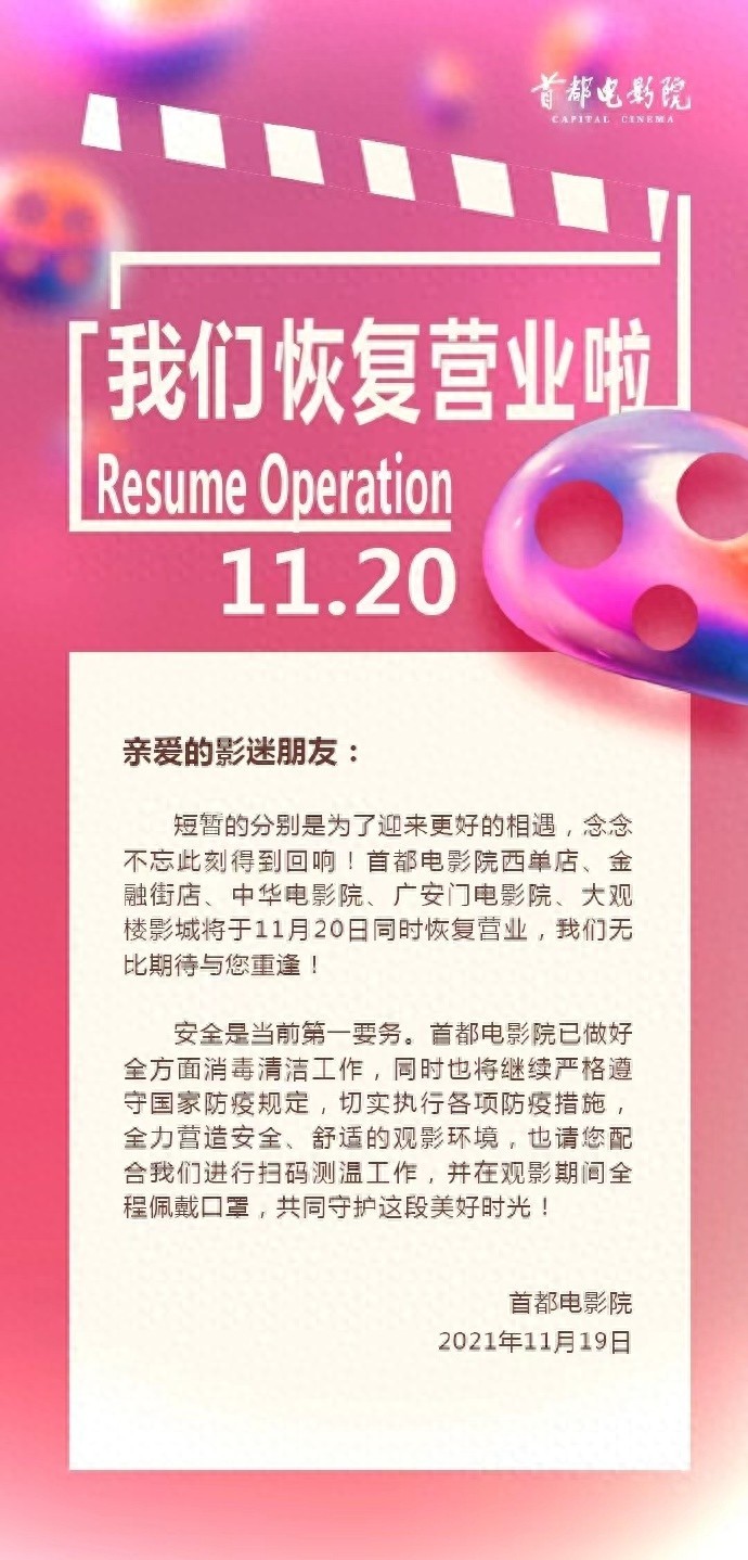 据@首都电影院消息,首都电影院西单店、金融街店、中华电影院、广安门电影院、大观楼影城将于11月20日同时恢复营业。