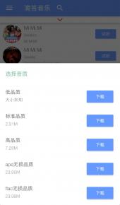 4、在搜索结果中,点击喜欢的歌曲,会弹出下载选择界面,选择歌曲的音质,点击对应的下载按钮即可,点击后,软件默认会自动调用手机的下载管理器下载歌曲。当然下载可以进软件的设置里设置存放路径,也可以设置调用第三方下载器下载