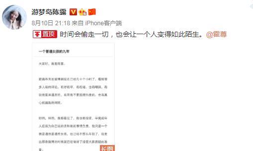 8月10日,陈露的小作文出来,讲述她和霍尊相处的点滴,还有所谓的渣男语录“我今时今日的社会地位还跟她在一起,对她就是一种恩赐了”。