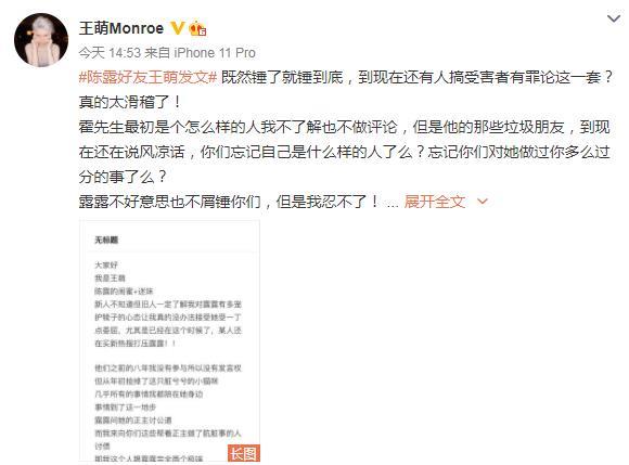 这还没完,陈璐的闺蜜王萌在霍尊发文后,直接爆锤霍尊方面曾威胁陈璐,更是以“吴秀波事件”举例。好歹两人也是多年的情侣,却这样设圈,能不能man一点。