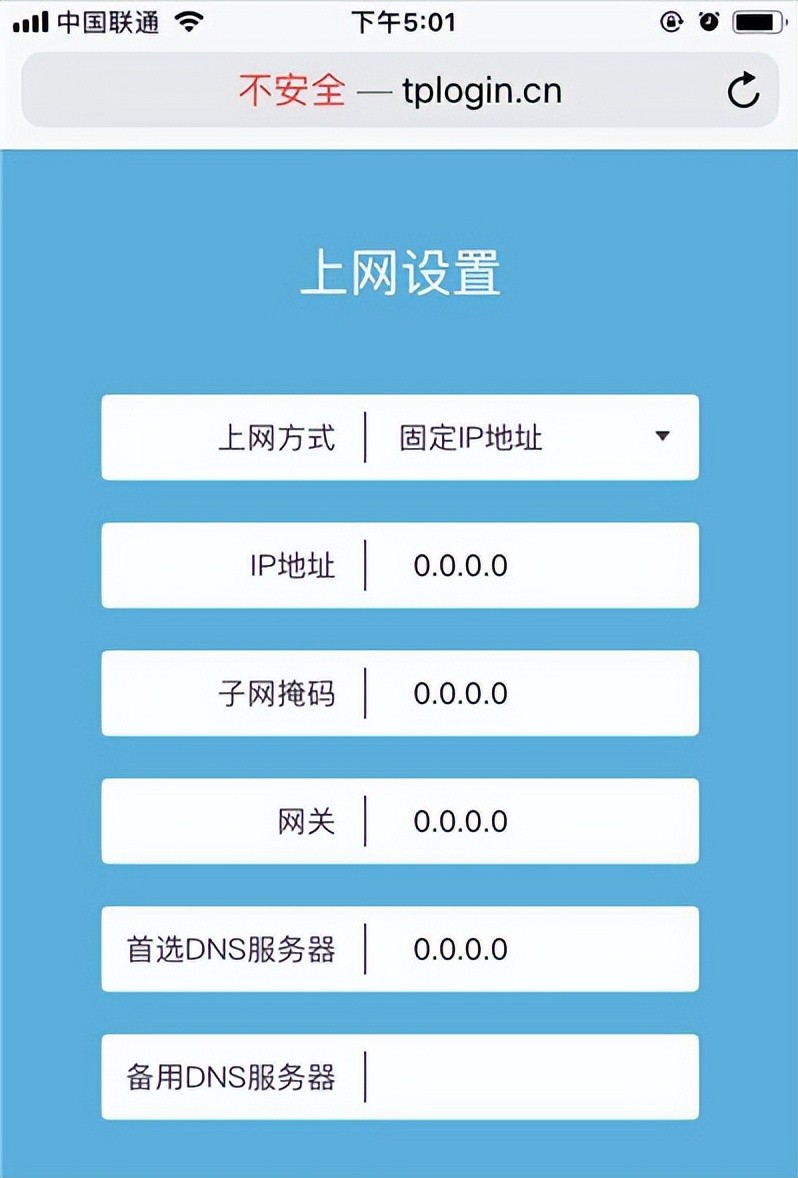 (3)如果识别到上网方式:固定IP地址(静态IP) ; 则需要在页面中,填写运营商提供的:IP地址、子网掩码、默认网关、首选DNS服务器、备用DNS服务器。