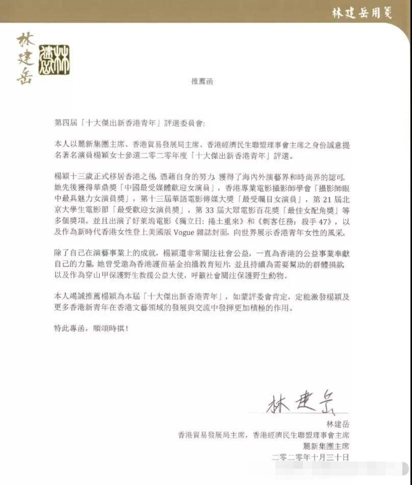 至于林建岳,直到2020年杨颖参加评选“香港十大杰出青年”,保荐人还是林建岳。