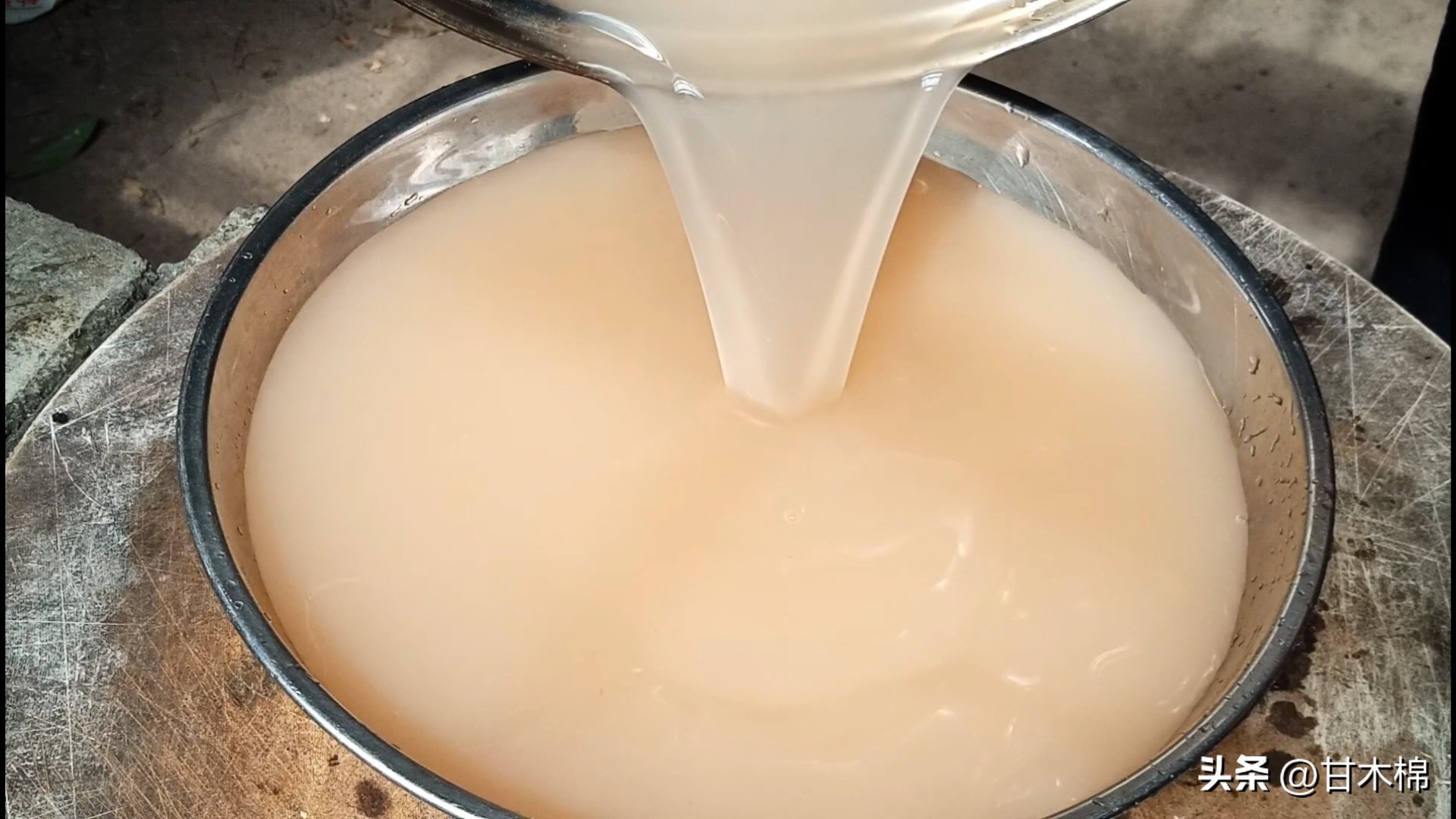 将揉搓好的汁液倒入平底盘或者碗中,放入冰箱里冷藏两到三个小时,也直接放置在桌面上等待凝固。