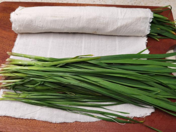 我们可以取一个干净的纱布或者棉布来代替报纸,我用的是我们家孩子小时候没用过的尿布。这种尿布就像纱布一样,将纱布展开,取一把摘干净的韭菜,放在纱布的一头,将纱布卷起,把韭菜包起来。在包韭菜时,韭菜白要全包住,尾部的叶子可以稍微漏出来一点没有关系,缠两三圈即可。如果纱布太长,卷到中间后,将纱布转过来,再放上一把韭菜,然后将纱布卷起,把韭菜包起来。然后将韭菜放到冰箱的保鲜内储存,随吃随取即可。