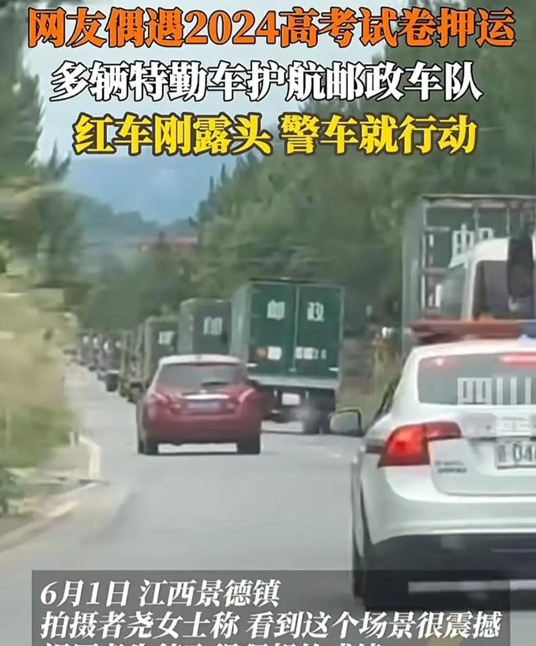 说起押运试卷,那可真是国之重器啊。人手一份便是人生大考,分分秒秒都关乎孩子的前途命运。所以啊,在护送途中哪怕是一丁点儿的风吹草动,都要小心防范,决不能有任何闪失。就在儿童节凌晨,江西景德镇的一位网友偶遇了这样的一幕:一车队正在蓝天白云下行进,那身姿硕大的红色货车,可不就是运送试卷的主力军吗?在队伍后方,除了有特勤队伍护航,还有多辆蓝白相间的警车盘旋在四周。不难想象,这可比押运钞票还严阵以待,可见试卷的份量啊!