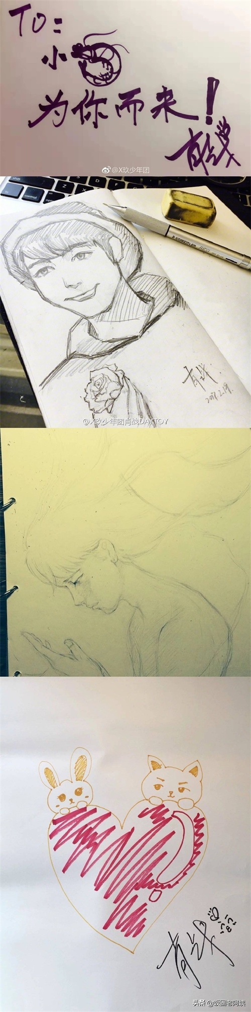 这是一组肖战亲自为小飞侠画的画。第一张的“给小飞侠,为你而来!”非常传神,战战真的是非常宠粉!用自己手中的画笔一笔一划地画出对小飞侠们的爱,这样的爱豆,谁能不爱呢?最后一张是一位幸运的小飞侠收到的战战画的亲笔画以及签名!实名羡慕了~