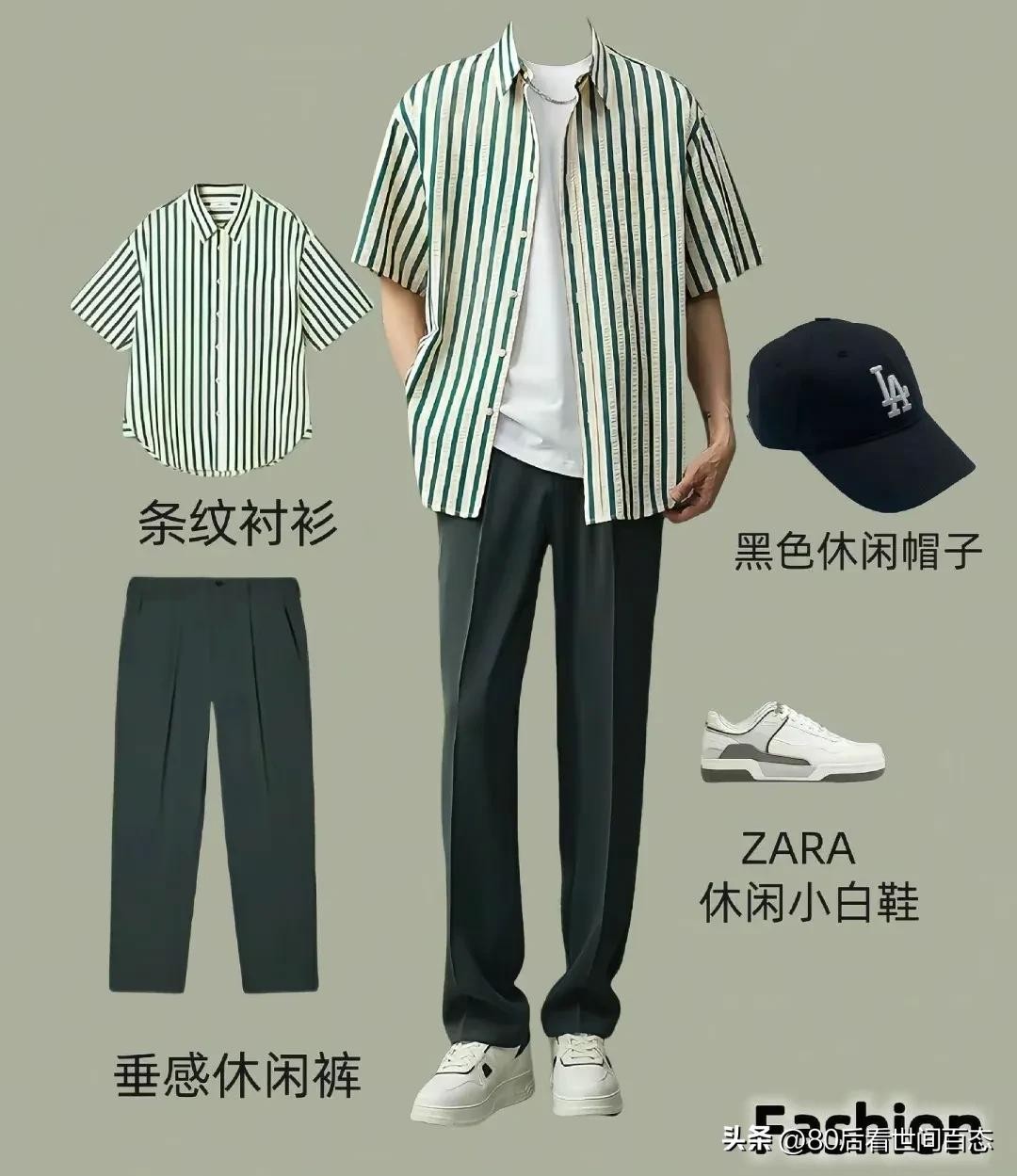 以条纹衬衫作为核心单品,外搭一件黑色休闲帽子,瞬间提升时尚度,增添一丝神秘感。下身搭配垂感十足的休闲裤,行走间飘逸灵动,尽显随性洒脱。再配上ZARA休闲小白鞋,简约百搭,与整体造型相得益彰。这套穿搭适合在下班后与朋友相聚街头,或是漫步在潮流街区,轻松成为街头时尚达人。