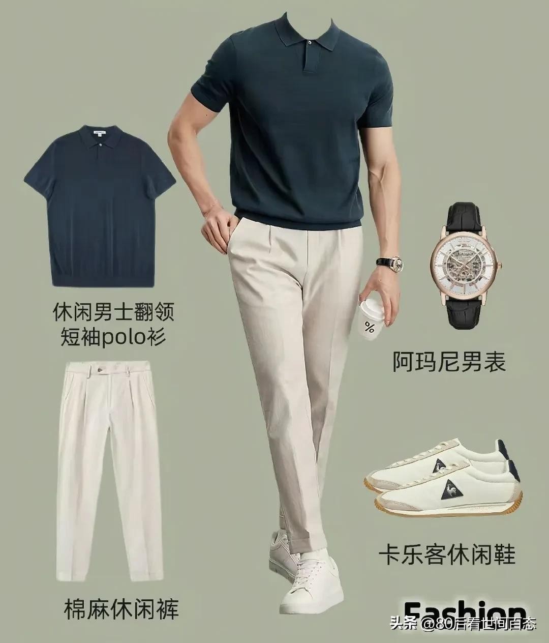 休闲男士翻领短袖polo衫,既保留了polo衫的优雅气质,又增添了几分休闲感。搭配阿玛尼男表,瞬间提升整体造型的档次,彰显品味与格调。下身选择棉麻休闲裤,透气舒适,质感十足。再配上卡乐客休闲鞋,简约大方,整体造型轻奢优雅,适合周末参加朋友聚会、约会等社交场合,轻松展现成熟男士的魅力。