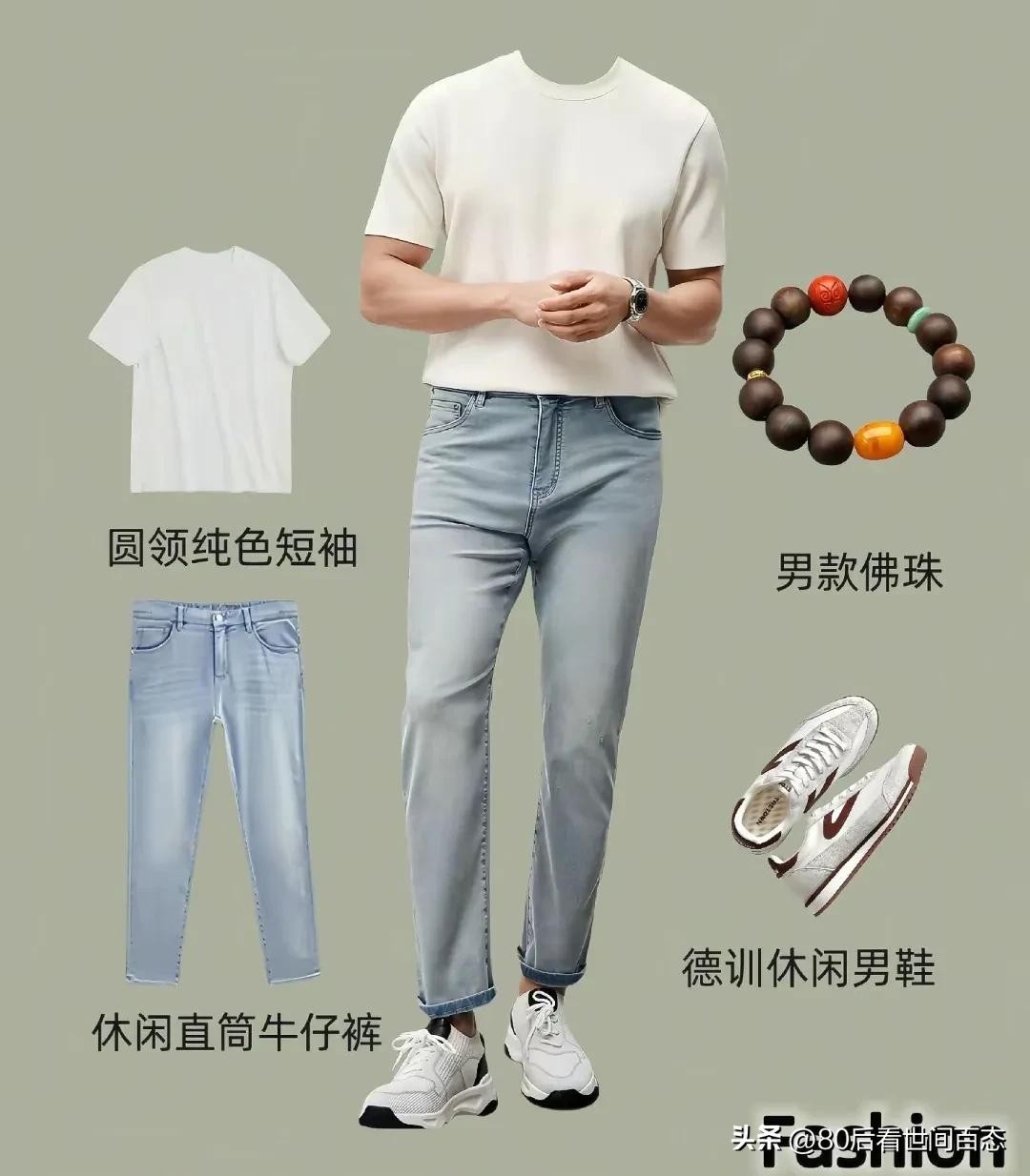 圆领纯色短袖是夏日不可或缺的单品,简洁大方又舒适透气。搭配男款佛珠,增添一丝禅意与个性。休闲直筒牛仔裤经典耐穿,能很好地修饰腿部线条。脚下的德训休闲男鞋,复古又时尚,兼具舒适度与潮流感。整套搭配适合周末出游、日常闲逛,让你在享受轻松惬意时光的同时,也能展现出随性自然的气质。