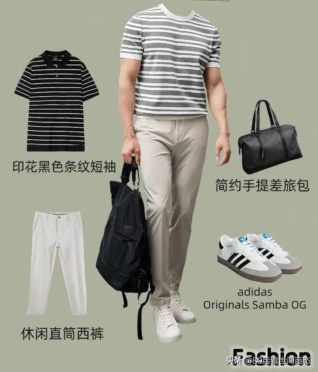 印花黑色条纹短袖个性十足,独特的印花设计彰显个人风格。搭配简约手提差旅包,实用又不失时尚感。下身选择休闲直筒西裤,中和了短袖的随意,使整体造型更加协调。脚上的adidas Originals Samba OG运动鞋,复古潮流,无论是逛街还是参加休闲聚会,都能轻松驾驭,展现出时尚不羁的态度。