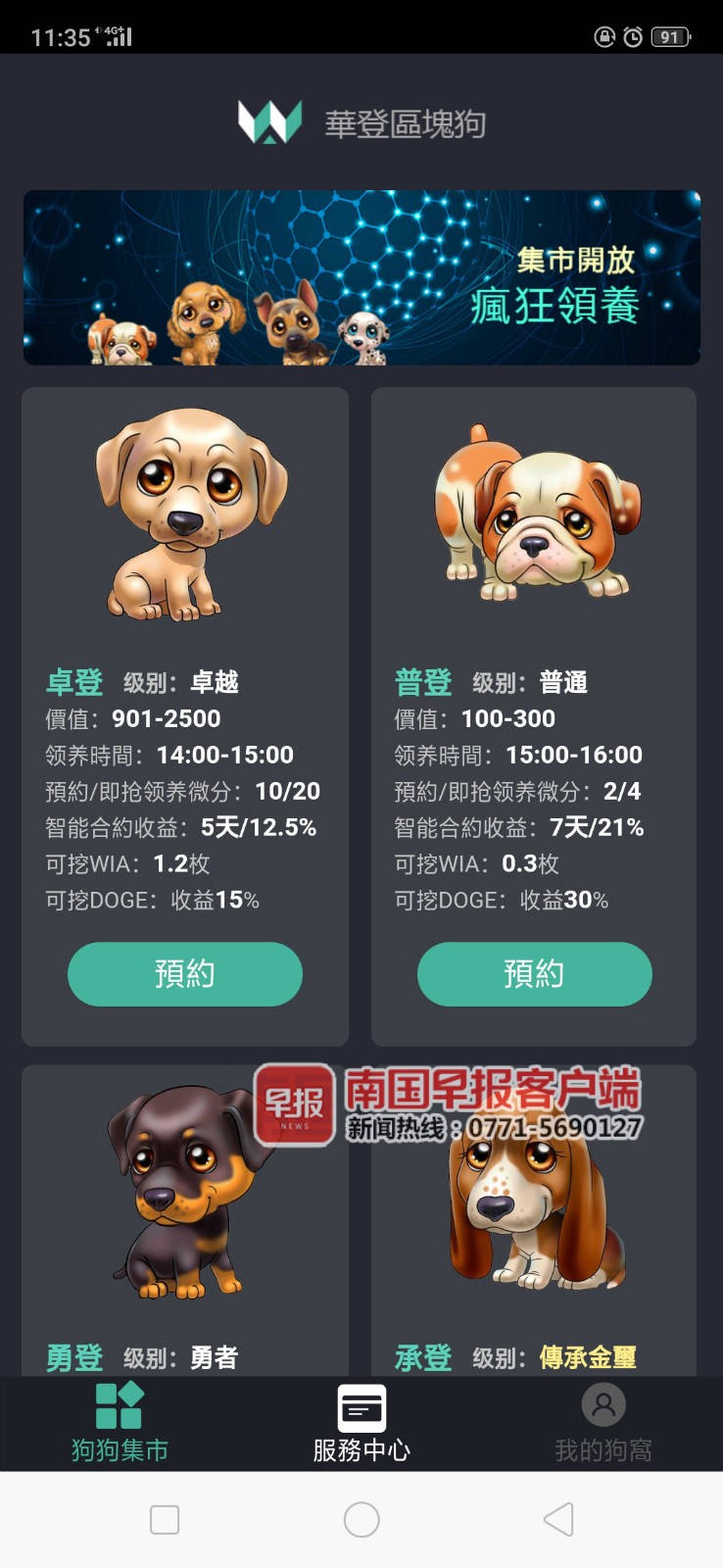 近日,多名南宁市民向南国早报客户端记者反映,他们在一款名叫“华登区块狗”的App领养虚拟宠物狗,由于该平台承诺有高收益,不少投资者纷纷“抢狗”,结果均被套了。目前,该App已无法登录,经营者疑似已跑路,投资者每人损失数千元至十几万元不等。据估算,仅在南宁,受害人就有2000多人。目前,投资者已向南宁市公安机关报案。