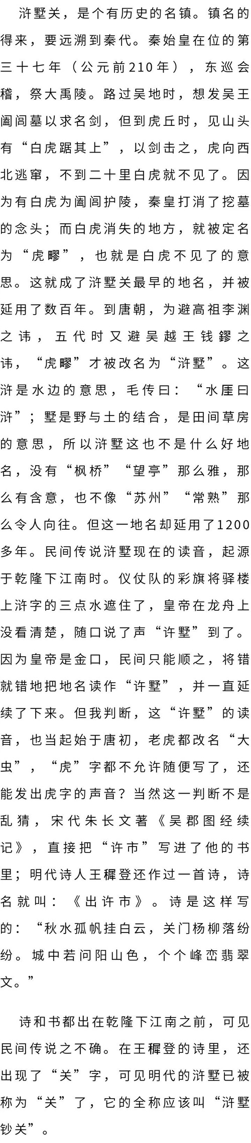 苏州城北二十余里有一大镇。镇名浒墅关,简称浒关,有时还被叫做“关廊”。镇边农民上街,常说:“到关廊去。”这“关”似乎成为了这一地名的重点。初闻“浒墅关”,会以为它和“雁门关”“山海关”一样,有耸峙的雄关,有险峻的隘口;会有动人的抗敌故事,甚至会产生“一夫当关、万夫莫开”的遐想,因为它毕竟是苏州城北的门户。然而到实地一看,情况完全不是这样。那里既无雄关,亦非隘口,水陆交通还特别方便。细查历史,这里除太平天国攻打苏州、新四军老六团夜袭车站,几乎没发生过什么战事。这里为什么叫浒墅关?不由人不猜度。