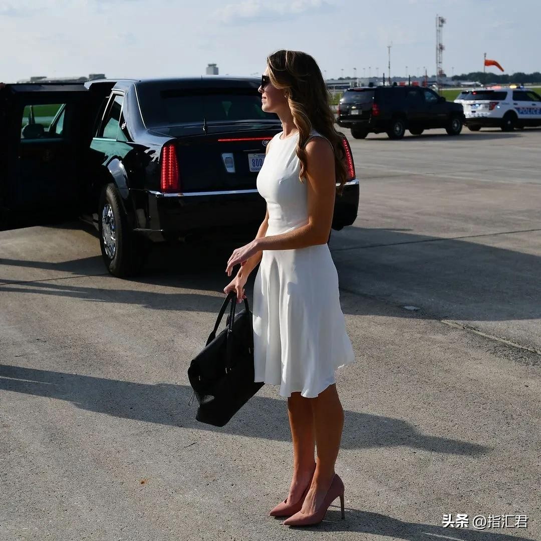 罕见穿亮色衣服从空军一号下机。深粉红相当吸睛,可看着有点像去度假。↓