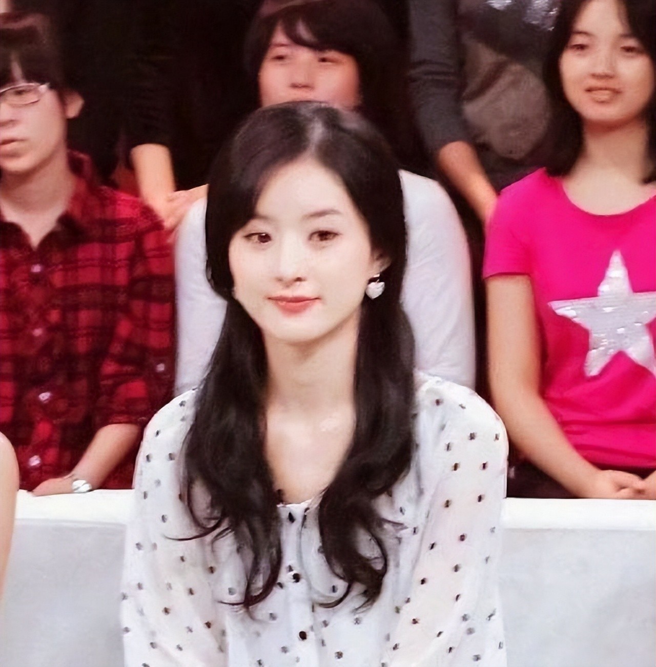 照片中赵丽颖梳着中分的发型,前面的头发有点翘起来,虽然那个时候的赵丽颖还不是特别出名,但是在节目中表现的还是非常开朗的,只是有些放不开。