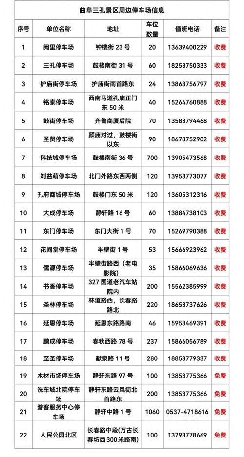 一、曲阜三孔景区周边停车场22家,可提供停车位3905个。