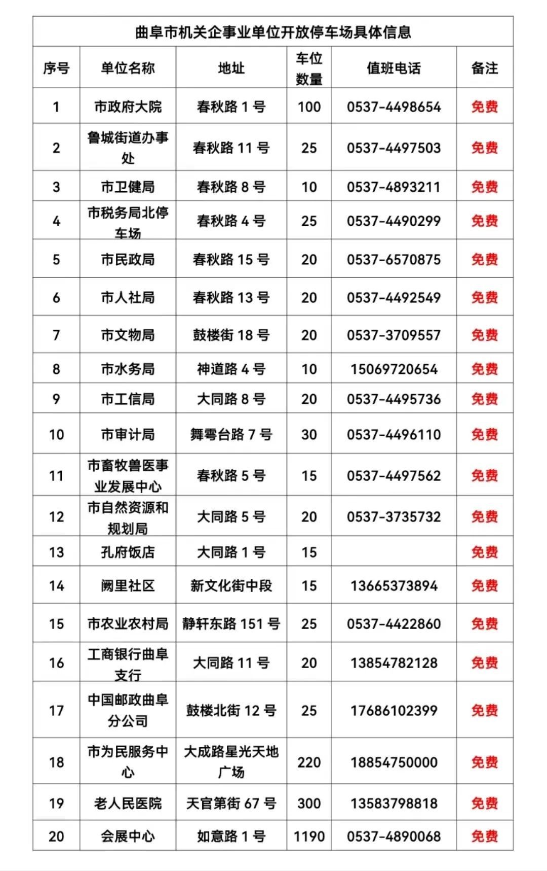 二、曲阜机关企事业单位内部停车场免费对外开放20家,可提供停车位2125个(开放时间:9月30日下午19:00—10月7日晚20:00)。