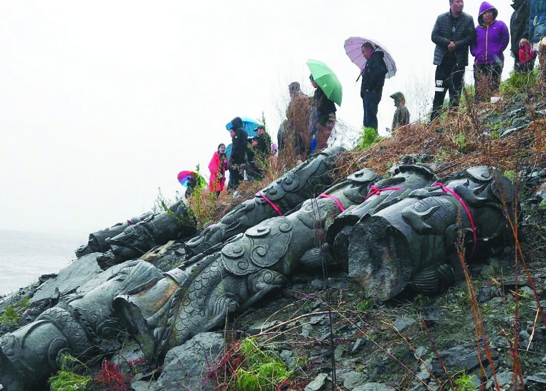 16日早8时许,打捞设备准备就绪,工作人员开始打捞。经过8个多小时的工作,石柱被陆续打捞上岸。据依兰县文管所所长王建军介绍,这些石柱共有7段,石柱上雕刻有盘龙,包括龙头、龙须、龙鳞等部位,全部雕刻饱满细节清晰。此外,石柱上还刻有云纹,目测7段石柱直径在60厘米左右,长1-2米。但是这些石柱的年代、是否为文物,还需经过专家进一步鉴定。