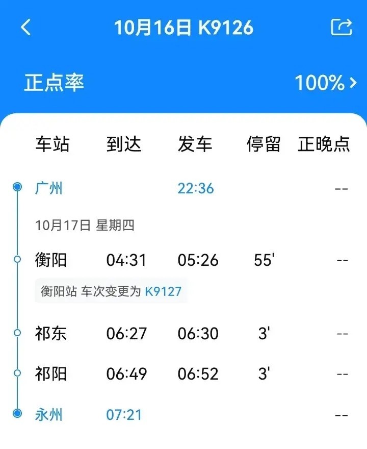 K9126广州至永州,属于祁阳、祁东人的专属普速列车,全程硬卧158