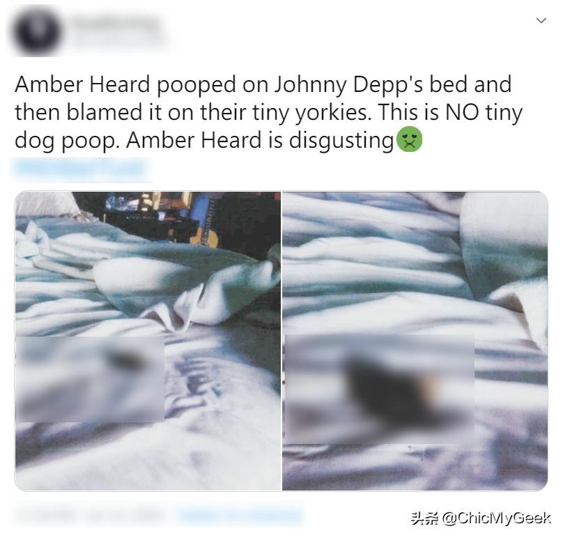 而当初法院的离婚文件中仅提到:「在2016年4月21日我把家中所有的个人物品与赫德小姐的东西分开,隔天早上艾梅柏·希尔德小姐或是她其中一个朋友,就在我的床上拉屎,然后他们就出发去Coachella 音乐节了。」并未提供照片作为证据。
