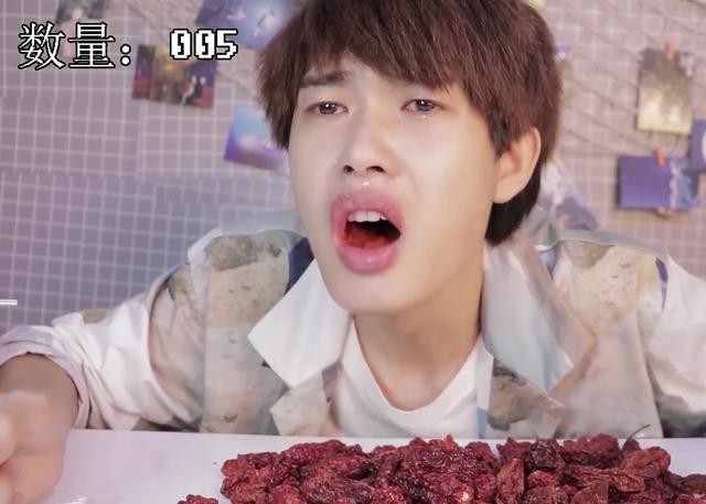 接下来我们看到他先尝试了一个魔鬼椒,如果观察仔细地话,不难发现,一个魔鬼椒吃下后他的嘴唇开始红肿,因为这种辣椒的辣度实在太辣,身体已无法承受。