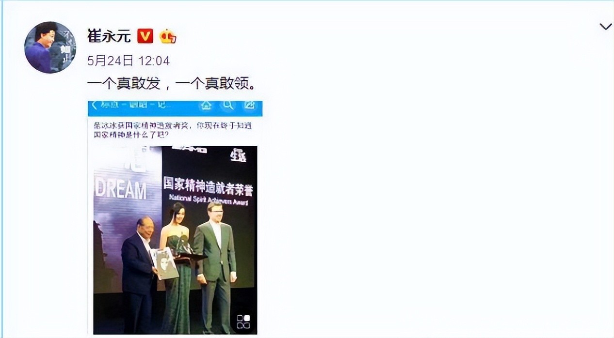 崔永元首先对“某冰”获得“国家精神造就者”荣誉称号提出了质疑,讽刺其德不配位。