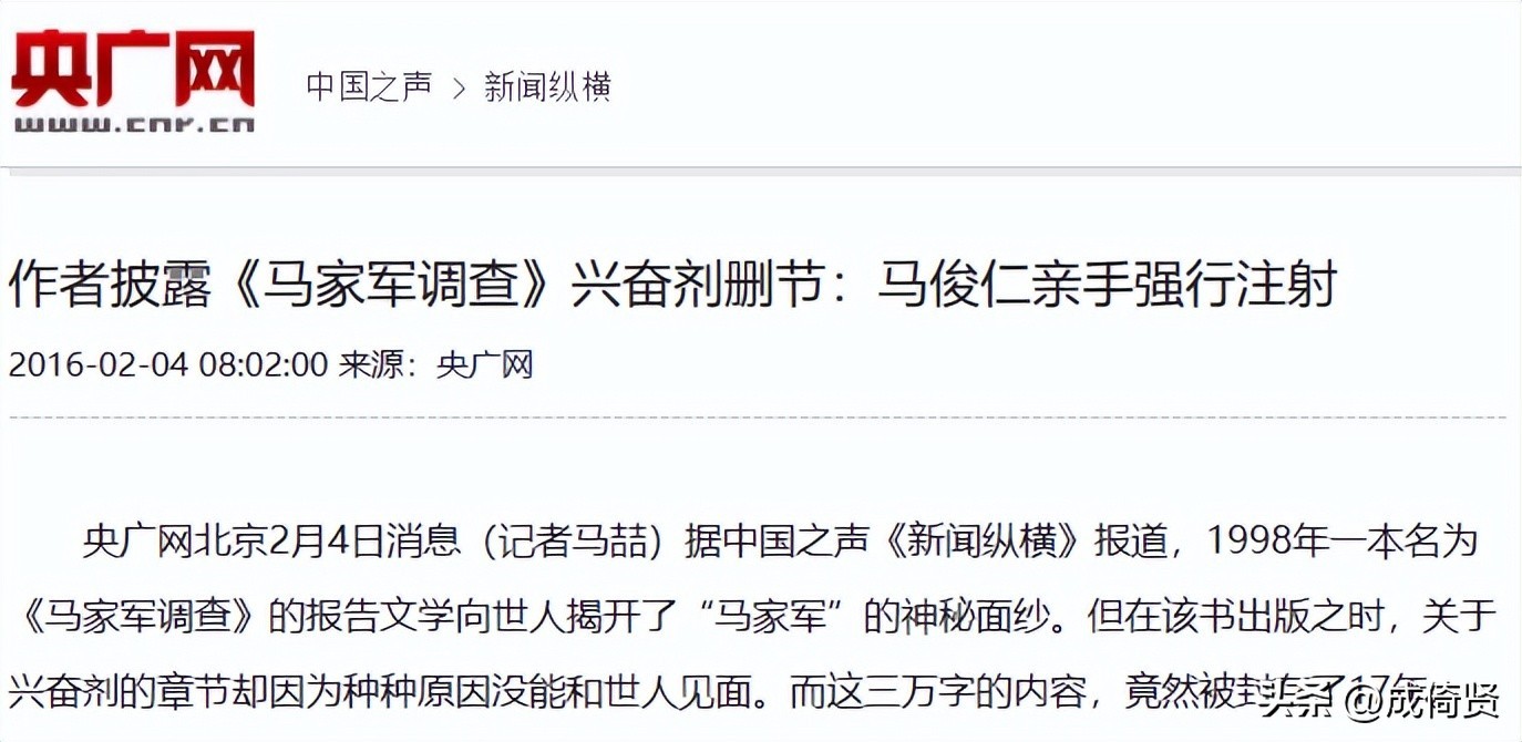 2.央广网:2016年2月4日,“作者披露《马家军调查》兴奋剂删节:马俊仁亲手强行注射”