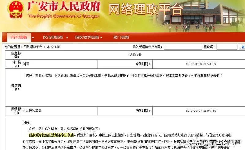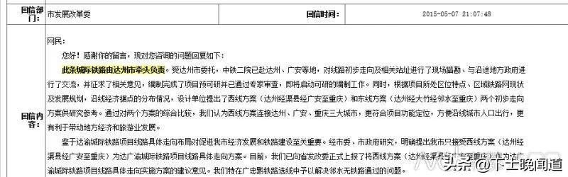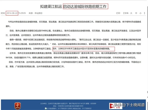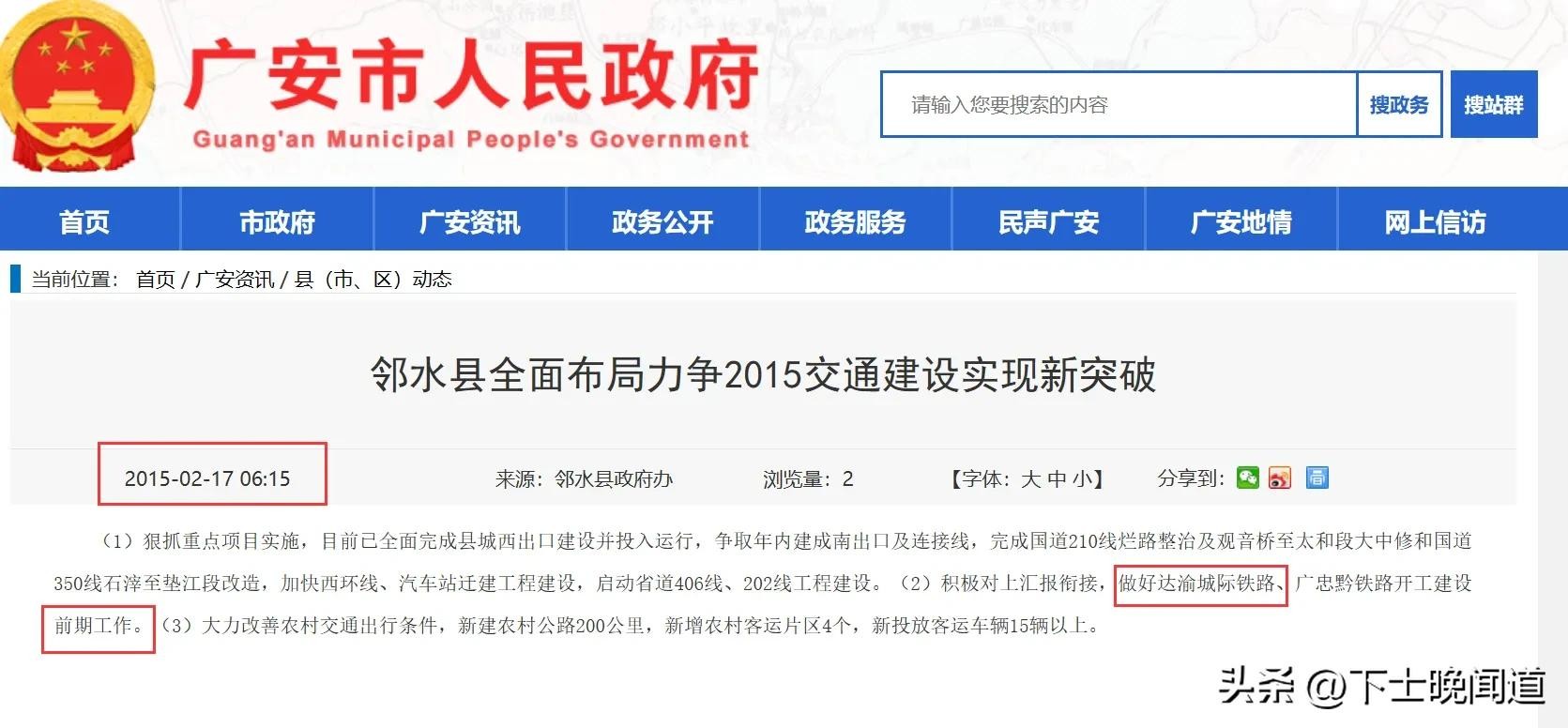 另外,与之对应的是:2015年2月17日,在广安市政府官网/广安资讯中查到,邻水县也积极对上汇报衔接、做好达渝城际铁路建设前期工作。