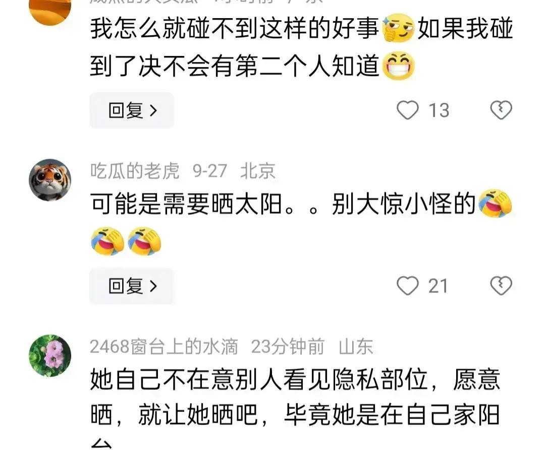 在如今这个信息爆炸的时代,网络上每隔一段时间就会出现一些令人咋舌的新闻。这不,最近就有一位女子在自家阳台上“光明正大”地晒太阳,结果引发了一场热议,网友们纷纷评论,观点各异,让人忍俊不禁。