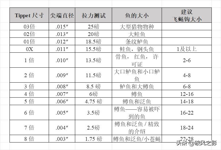 X系统(X system):数字越大,线越细,拉力值越小,所以5X、6X的线的直径要比1X、2X的小很多。3法则公式:飞蝇钩大小除以3,可得到子线号数的大致范围,比如你用12 号若虫或干蝇钓鱼,请将尺寸除以 3 得到 4,因此你应该使用 4x 的子线,那么配套使用4X的前导线;钓 22 号苍蝇时,您将使用 7 X的子线和前导线。还需考虑垂钓鱼的大小和水质清澈度来调整线号,如果你垂钓的鱼的个体较大,但是使用的飞蝇钩又没那么大时,按这个公式来算,大概率要断线跑鱼。这个时候你是要适当使用大号一点的前导线。还有你垂钓的水的清澈度,如果很清澈的水里垂钓,即使你用大号的钩子,那么先太粗的话鱼的警惕性就会很高,就不咬了,所以要适当的降低线的号数。