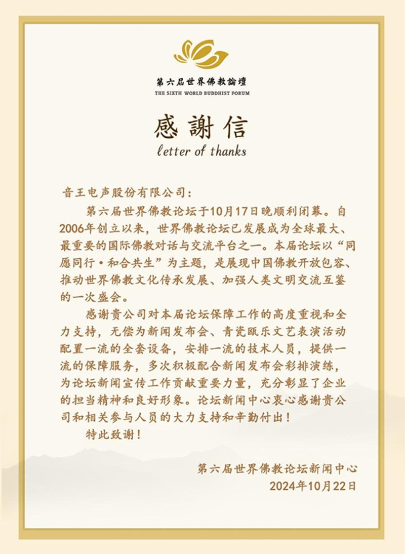 展望未来,音王音响将继续秉持技术创新与文化传承的双重使命,以其在音频技术领域的深厚底蕴与卓越成就,为更多国际文化交流活动提供强有力的技术支持与保障。相信在未来的日子里,音王音响将携手全球佛教界及各界朋友,共同推动人类文明的交流互鉴,为促进世界和平、增进人类福祉贡献更多的智慧和力量。(编辑:刘威佳 供图:音王集团)