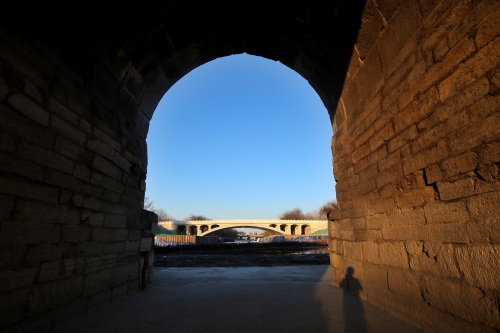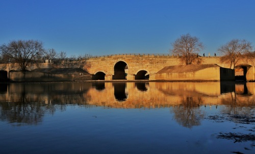横跨通惠河的八里桥始建于明代正统十一年(公元1446年),古称永通桥,现位于朝阳区管庄乡八里桥村东南,因地处通州城西八里处,又被称为八里桥。 图为朝阳下,老八里桥被铺上一层金色,更显古韵。 白继开 摄